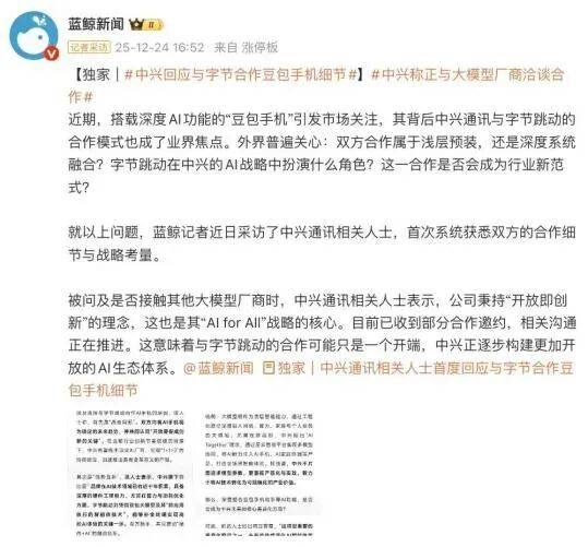 被问及是否接触其他大模型厂商时,中兴通讯相关人士表示,公司秉持“开放即创新”的理念,这也是其“AI for All”战略的核心。目前已收到部分合作邀约,相关沟通正在推进。这意味着与字节跳动的合作可能只是一个开端,中兴正逐步构建更加开放的AI生态体系。