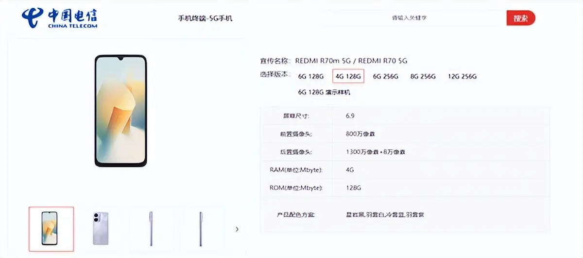 在核心配置上,红米R70M首次抛弃发哥和高通的处理器,转而采用紫光展锐的处理器,进一步的压低成本,具体的芯片型号目前还不清楚,但估计好不到哪里去。内存组合有多个版本,从4G+128G,6G+128G,6G+256G,8G+256G到最后顶配12G+256G