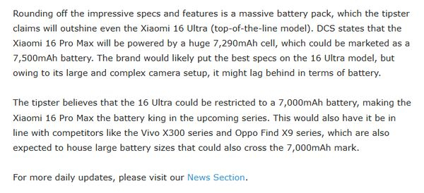 据爆料,小米16 Pro Max预计将搭载一块高达7290mAh的大容量电池,实际宣传中有可能以“7500mAh”作为标称值。这一数字远超同系列中的其他机型,甚至可能超过定位更高的小米16 Ultra。爆料人指出,由于Ultra版本采用了更为复杂、体积更大的摄像头模组,电池容量或将被限制在7000mAh左右,反而让Pro Max版本在续航方面占据优势。