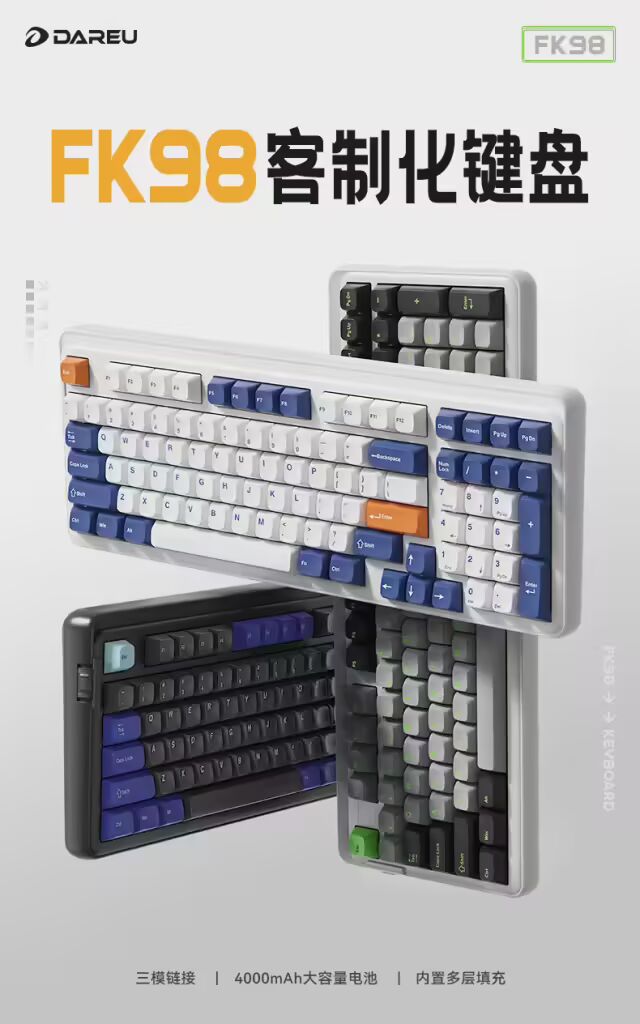 4 月 13 日消息,达尔优 Dareu 本月 9 日在电商平台上线了 FK98 键盘,到手价 279 元。这一型号采用 96%配列,搭载机械触点式的渊紫轴,支持三模连接,内置 4000mAh 电池。