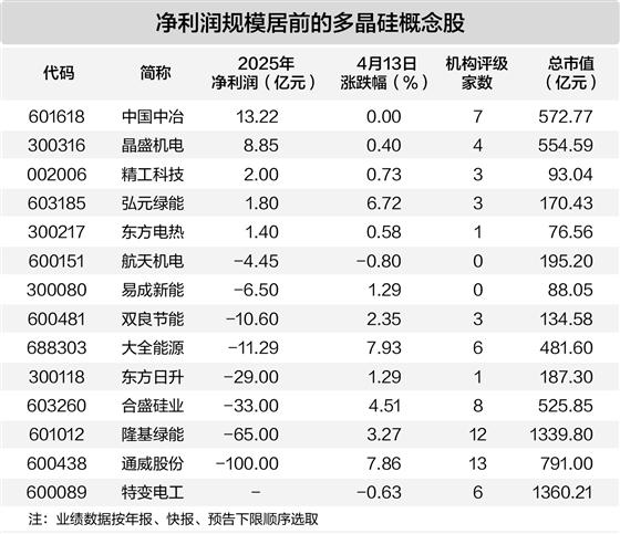 据证券时报·数据宝统计,A股中布局多晶硅产业链的个股共有14只,其中13只已披露2025年业绩相关数据,净利润按年报、快报、预告下限统计,有5股2025年度有望实现盈利,中国中冶、晶盛机电、精工科技的净利润金额居前,均超过2亿元。