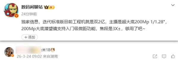 【CNMO科技消息】3月24日,数码博主“数码闲聊站”爆料称,某厂商迭代标准版手机采用双2亿像素传感器。其中,主摄为1.28英寸超大底2亿像素传感器。并且,潜望长焦同样为2亿像素大底镜头,该镜头支持入门级微距功能,焦段为3倍左右。据网友猜测,该机型可能为预计今年9月发布的小米18标准版。