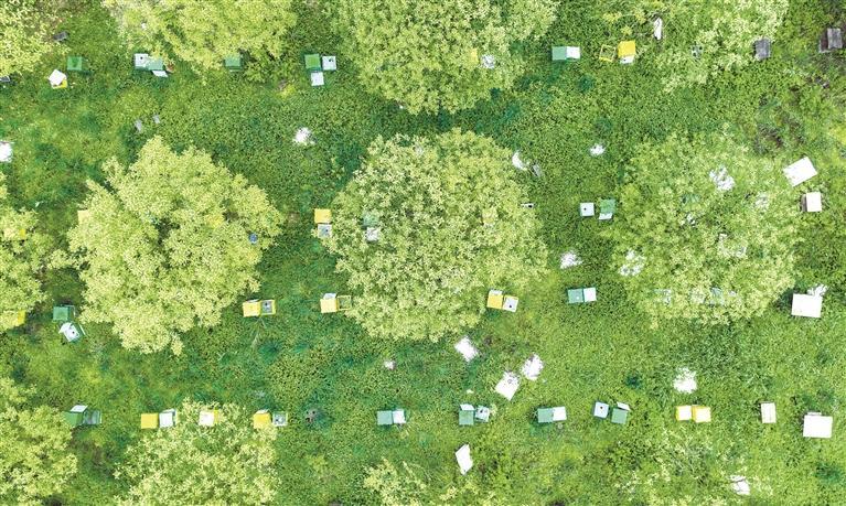 俯瞰道真自治县大磏镇文家坝村,智慧蜂箱散落山野。在茅台集团帮扶下,当地依托生态发展蜜蜂养殖,以甜蜜产业助力乡村振兴。陈超摄上坝土家族乡食用菌园一角。陈超摄