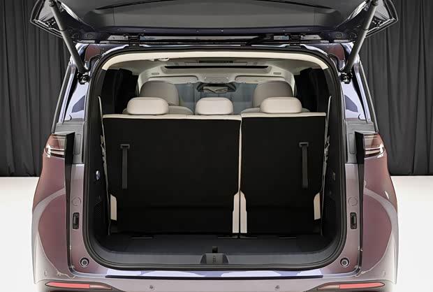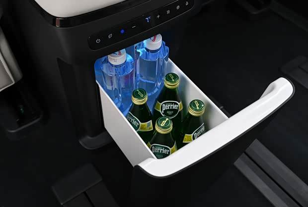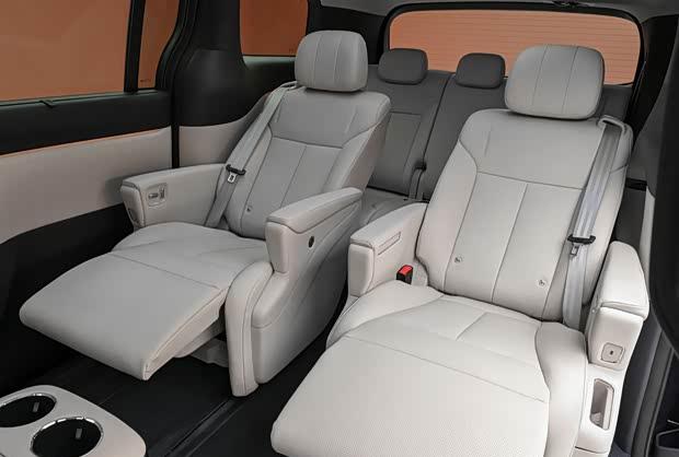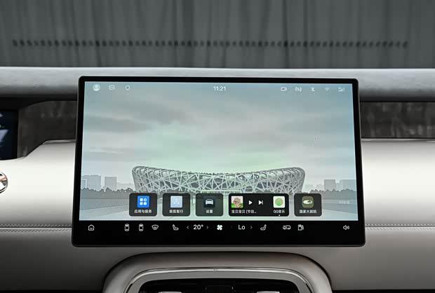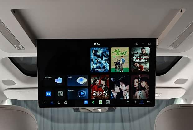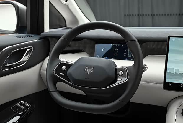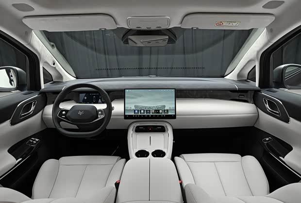 进入车内,内饰采用双色搭配,并配备256色星河光韵氛围灯。中控区域装有大尺寸悬浮式屏幕,方向盘为两辐式设计,前方设有小尺寸仪表屏,中控台下方还提供了无线充电面板。座椅布局为2+2+3的七座形式,前排头枕集成音响,全车共搭载22个扬声器。第二排配备两张独立零重力座椅,支持16点按摩、通风加热及腿托调节,可实现躺姿。同时,二排还设有吸顶屏、小桌板及车载冰箱。