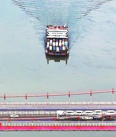 一艘滚装船通过鱼嘴长江大桥。(重庆日报资料图片)特约摄影钟志兵摄/视觉重庆