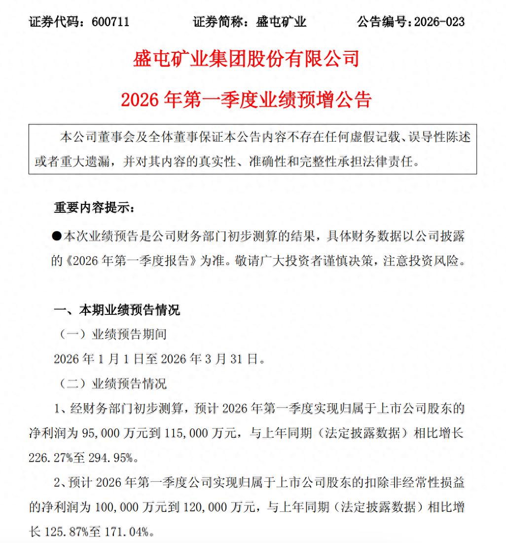 根据盛屯矿业最新发布的2026年一季度业绩预告,预计报告期内实现归属于上市公司股东的净利润为9.5亿元至11.5亿元,与上年同期相比增长226.27%至294.95%;扣除非经常性损益后的净利润为10亿元至12亿元,同比增长125.87%至171.04%。