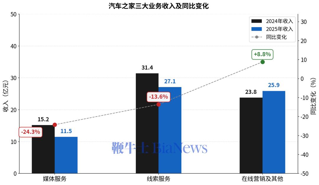 打开它的财报,六成收入来自两大块。第一块是向车企收取的“媒体服务费”(主要是广告费)。车企为了建立品牌形象,会在网站和App上投放开屏、焦点图等广告。这门生意其实是向车企“卖曝光”,按时长或展示位置收费。另一块是向经销商“卖线索”,经销商为潜在客户的联系方式付费。平台将用户的询价、试驾预约等信息(即“销售线索”)分发给经销商,经销商按会员订阅付费。在汽车市场高速增长的年代,这种高度依赖车企、经销商营销预算的模式相当好赚,汽车之家把用户注意力拆分成广告位和销售机会,坐在中间收“过路费”,毛利率长期在75%以上。但天花板也很明显,当行业增速放缓、价格战加剧,最先被砍的往往就是这笔“广告和获客预算”。根据中汽协数据, 2025年,中国汽车产销量均突破3400万辆。但高销量背后,行业竞争也更激烈,价格战蔓延,车企和经销商的利润空间被持续压缩,广告预算随之收紧。而造车新势力更倾向于建立直营销售体系和私域用户池,对第三方平台的依赖度明显下降。与此同时,用户注意力也迅速被微博、短视频、直播等渠道分散,汽车垂直媒体不再是用户获取信息的唯一入口。反应到汽车之家的财报中:2025年,其媒体服务收入同比下降24.3%,只有11.5亿元。相比2019年约36亿元的高峰,五年时间缩水接近六成。经销商的日子也不好过。在激烈价格战下,他们对“买线索”这件事越来越谨慎。一位汽车经销商对「定焦One」表示:“平台的线索很多是重复的、无效的。以前是人找车,我们等线索;现在是车找人,我们得直播、搞社群。”汽车之家在财报中明确提到“付费经销商数量减少”。结果是,它最大的收入来源线索服务收入也开始下滑。2025年,这一收入同比下降13.6%至27.1亿元。旧模式跑不动后,汽车之家把手伸向离成交更近的环节:做商城(汽车之家商城,Autohome Mall)、做O2O、下沉市场加盟门店“汽车之家空间站”,在财报中被归为“在线营销及其他业务”。2025年,这部分收入为25.9亿元,同比增长8.8%,在总营收中的占比升到了40.1%。活更重了,但赚到的钱并没有同步增长。一位汽车电商从业者表示:“新零售本质上是重资产业务,汽车之家为了拓展下沉市场,需要承担部分交易、物流甚至补贴成本。”财报数据印证了这一点:2025年汽车之家的营业成本同比增长20.3%至17.8亿元,财报明确提到,这主要来自新零售业务在下沉市场扩张产生的交易成本。可另一边,公司总收入却在下滑。结果就是,毛利率从2024年的78.9%掉到了72.4%。一位曾关注汽车之家的投资人提到,作为参照,美国汽车导购与经销商撮合平台TrueCar近年的毛利率仍在80%左右。TrueCar本身并不直接卖车,主要向消费者提供选车、比价和经销商撮合服务,和汽车之家早期“卖流量、卖线索”的模式更接近。现金流也有了压力。2025年全年,汽车之家的经营性现金流净额降至8.9亿元,明显低于过去常年20亿元以上的水平。最终反映在盈利能力上:2025年,经调整净利润16.1亿元,较2024年的20.5亿元,下滑了21.6%。从季度表现看,这种压力还在加深: 2025年Q4收入14.6亿元,同比下降18%;经调整净利润3亿元,同比下滑37.6%。