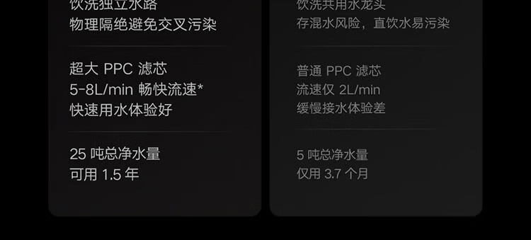 米家即热净水器 2 Pro 双出水采用双重即热 3.0 技术,鲜热水流速 1.5L/min,换热模式下单次可取用 95°C 鲜热水达 10L;采用冷水自动回流技术,出水前管道内冷水自动回流排出,拒绝冷热混合,出水温度更精准;双龙头独立供水,上龙头直出母婴级健康纯净水,下龙头深滤生活水。双水路物理隔绝,避免交叉混水。