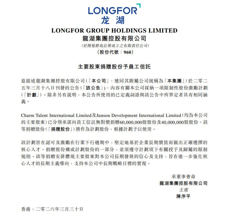值得一提的是,在行业困难时期,龙湖大股东选择以真金白银来激励和留住人才。2026年3月30日,龙湖集团发布公告称,主要股东Charm Talent International Limited和Junson Development International Limited宣布向员工信托无偿捐赠合计1亿股公司股份。按目前股价计算,价值超7亿元。此次捐赠的股份将纳入龙湖集团“限制性股份激励计划”,用于激励在行业下行周期中坚持企业长期价值的核心人才。