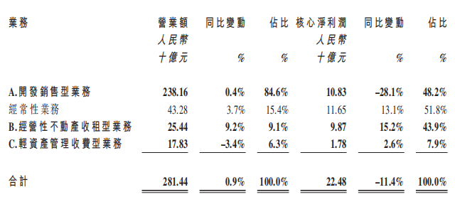 2025年,华润置地综合收入为2814.4亿元,同比增长0.9%。其中,开发销售业务收入为2381.6亿元;经营性不动产收租型业务收入为254.44亿元;轻资产管理收费型业务收入为178.34亿元。经常性业务收入合计为432.8亿元,同比增长3.7%,占总营业额15.4%。
