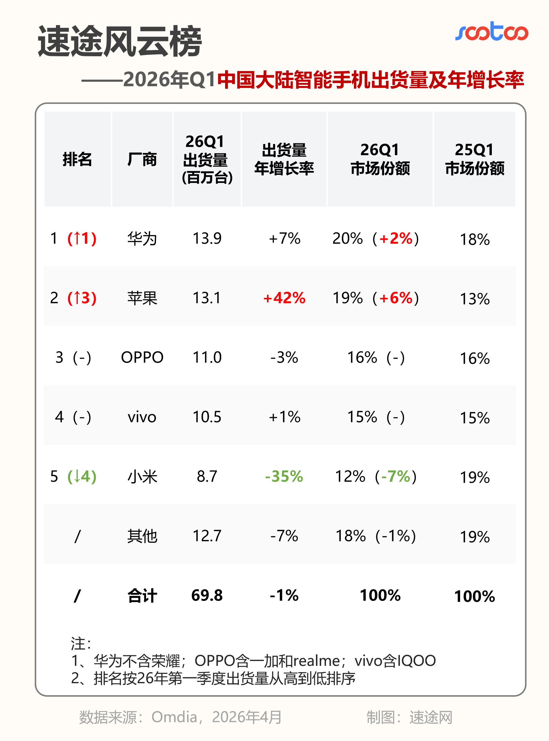 速途网4月14日消息,Omdia发布的最新研究数据显示,2026年第一季度中国大陆智能手机市场同比下滑1%,出货6980万台。