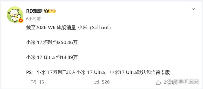 截至2026年第6周,小米17系列的累计销量为364.95万台(含Ultra),继续排名2025年底国产新旗舰的销量第一。