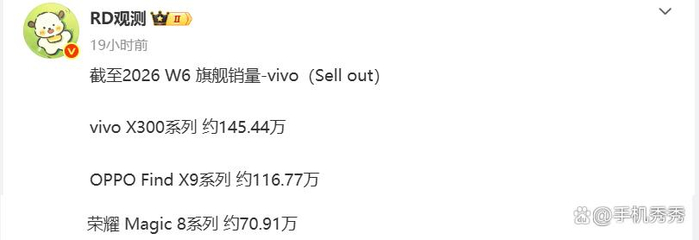 在苹果小米华为之后,是另外三大国产旗舰系列:vivo X300累计销量约145.44万台,OPPO Find X9系列约116.77万台,荣耀Magic 8系列约70.91万台。