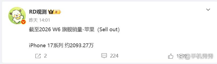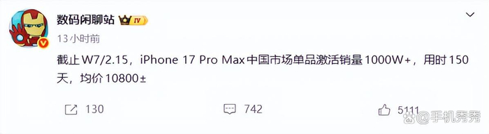 另一博主“数码闲聊站”的数据显示,截至2026年第7周,iPhone 17 Pro Max在中国市场的激活销量超1000万台。