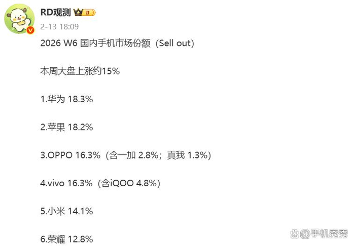 2026 W6国内手机市场份额前6依次为:华为(18.3%)、苹果(18.2%)、OPPO(16.3%)、vivo(16.3%)、小米(14.1%)、荣耀(12.8%)。