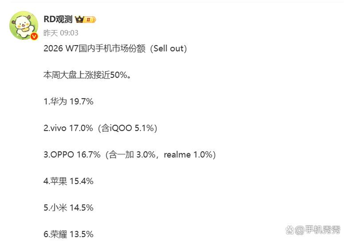 另据该博主提供的数据显示,在2026 W7国内手机市场份额前六名中,华为继续排名第一,市占率接近20%。
