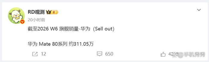 华为Mate80系列的销量也再创新高,截至2026年第6周,Mate 80系列的累计销量已经达到了311.05万台,每月销量都超过了100万台。
