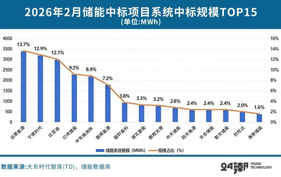 市场也给出了自己的判断:2025年,国内储能系统集成商出货排名,远景位列第三、比亚迪位列第六。进入2026年,这种‘强者恒强’的趋势愈发明显。在2月中国储能中标项目中,远景以13.7%的市场份额位列集成商第一,比亚迪位列第三。