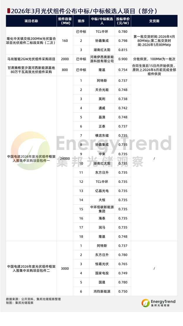 据集邦光储观察不完全统计,2026年3月已公布中标结果及中标候选人的组件规模为42.57GW,含已定标规模11.57GW,第一中标候选人规模31GW。中国电建31GW组件集采、华电集团8GW组件集采项目贡献核心增量。