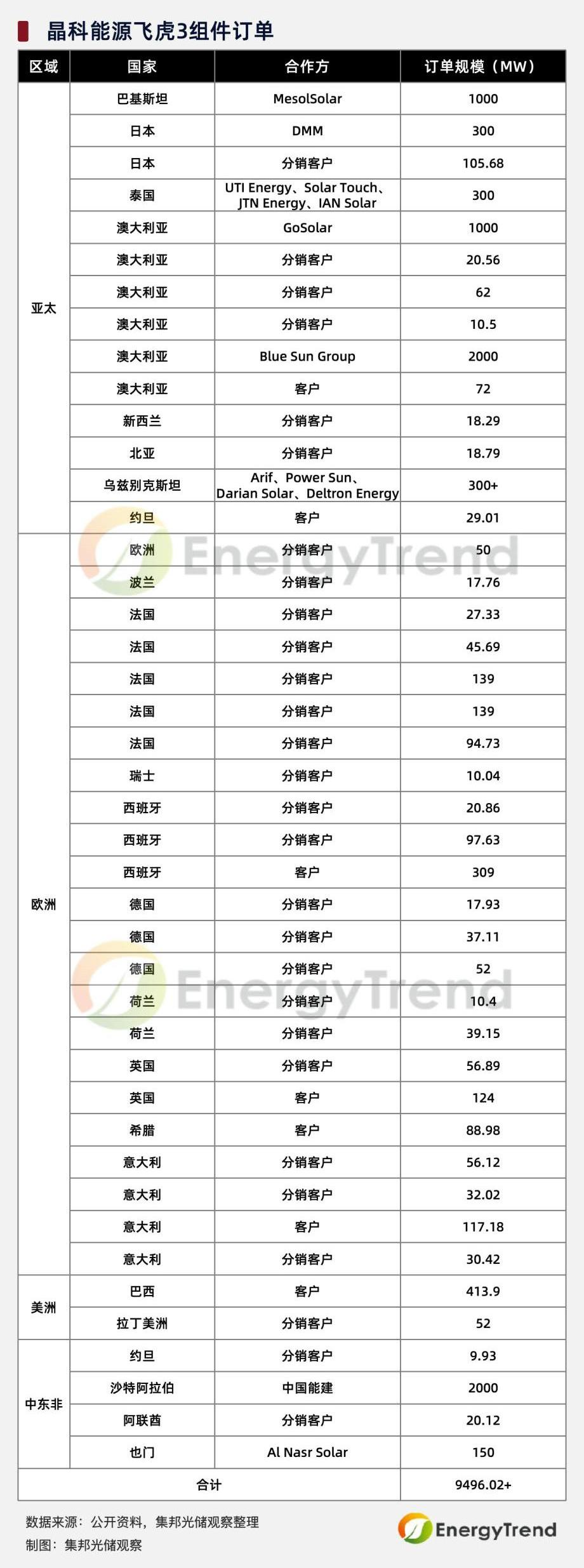 据集邦光储观察不完全统计,目前,晶科能源飞虎3(Tiger Neo 3.0)系列N型高效光伏组件全球累计签约订单已近9.5GW。