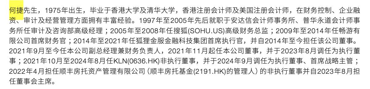 资料显示,何捷,1975年出生,毕业于香港大学及清华大学,香港注册会计师及美国注册会计师,在财务控制、企业融资、审计及经营管理方面拥有丰富经验。