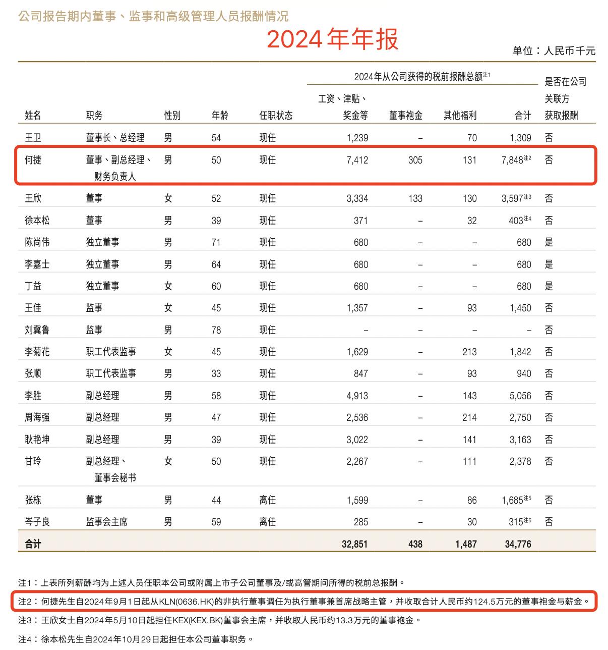 而2024年,何捷从顺丰控股获得的税前报酬总额为784.8万元,从子公司KLN获得董事袍金与薪金124.5万元,两项合计909.3万元。