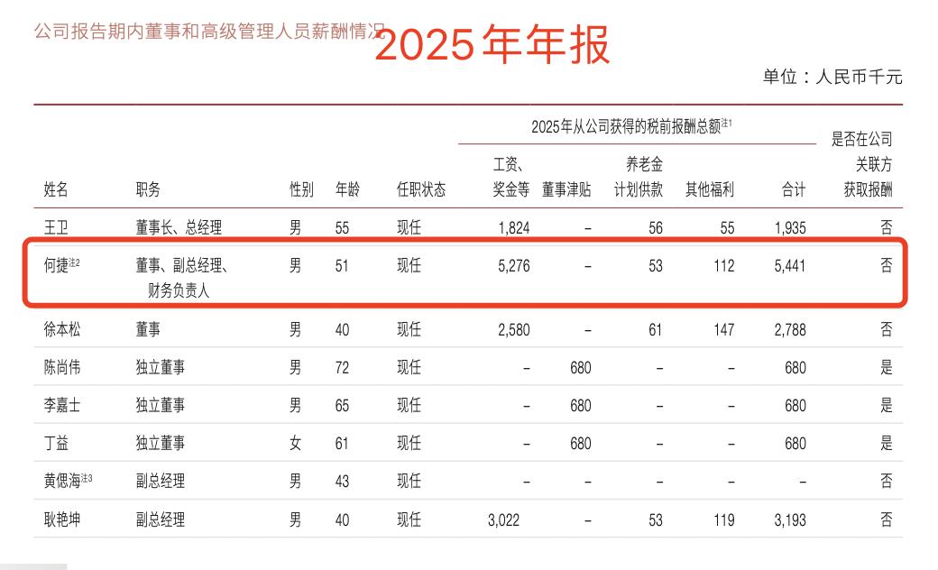 值得关注的是,公司董事、副总经理、财务负责人何捷,从公司获得的税前报酬总额为544.1万元,这一数字在公司内部高管薪酬中已属最高水平。何捷还从子公司KLN获得的薪金福利等报酬约482.1万元。两项合计年达1026.2万元,成为又一位年薪突破千万元的A股上市公司财务总监。