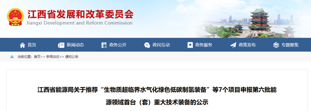 根据《国家能源局综合司关于组织开展第六批能源领域首台(套)重大技术装备申报工作的通知》要求,我局组织各设区市发展改革委、各有关驻赣央企申报项目,经审查、评审等程序,拟推荐“生物质超临界水气化绿色低碳制氢装备”等7个项目申报能源领域首台(套)重大技术装备,现予以公示,公示期为2025年4月13日至2025年4月17日。如有异议,请于2025年4月17日前向省能源局反映。