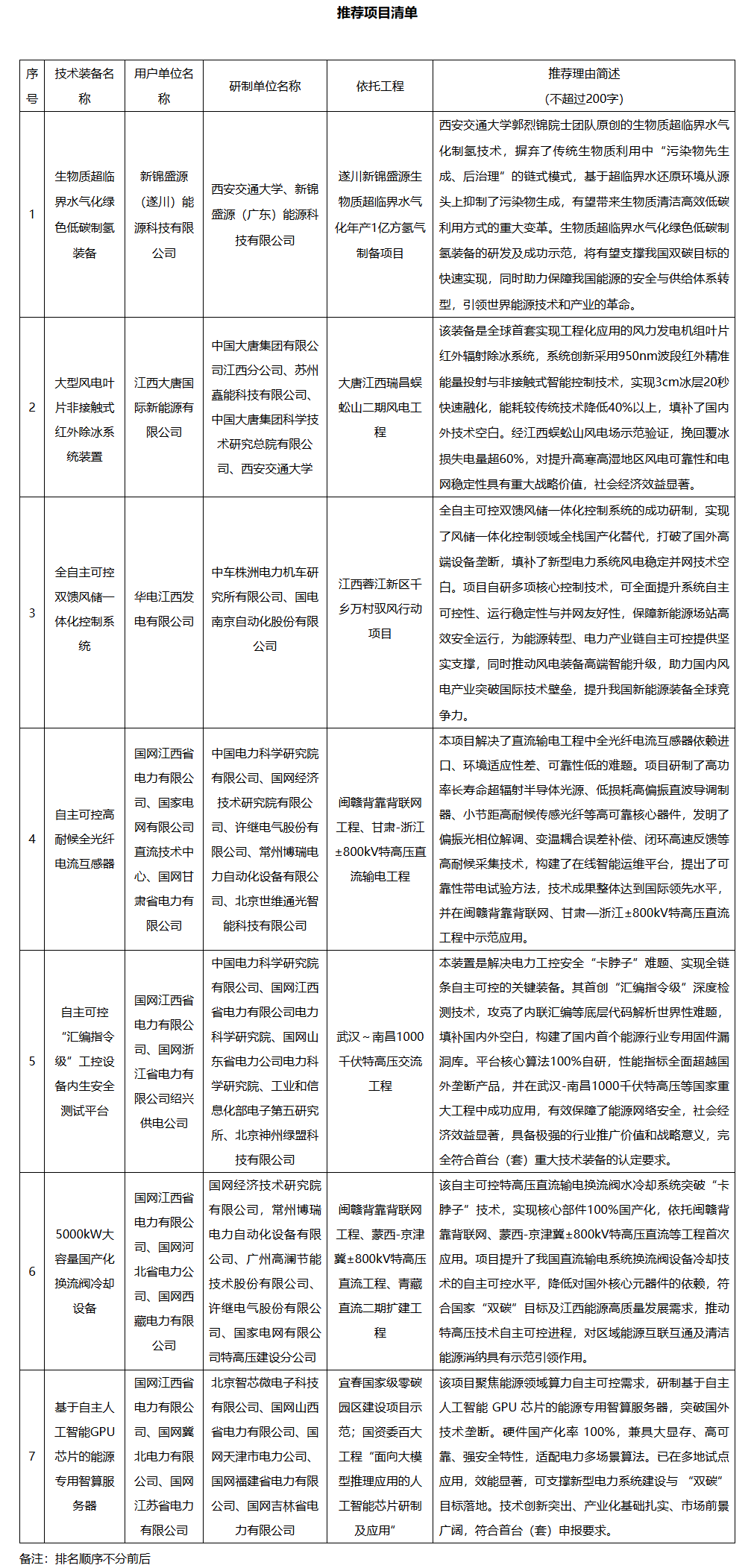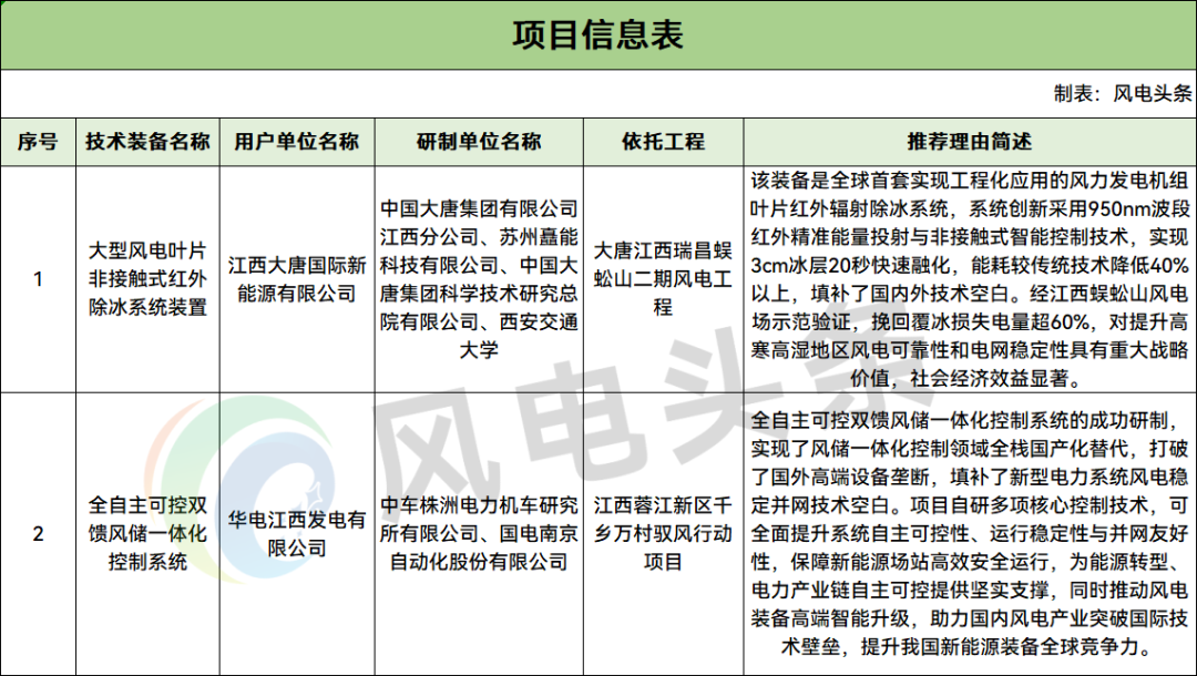 内容显示,大唐集团江西分公司、苏州矗能科技有限公司、大唐科研总院、西安交通大学联合研制的“大型风电叶片非接触式红外除冰系统装置”技术设备与中车株洲所、国电南自联合研制的“全自主可控双馈风储一体化控制系统”技术设备位列其中。