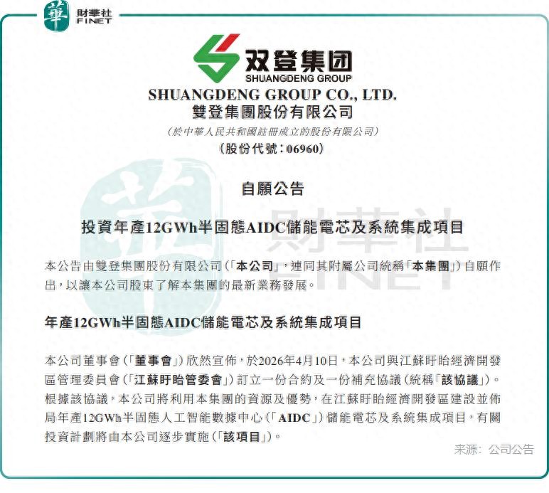 4月10日,双登股份发布公告,与江苏盱眙经济开发区管理委员会签署协议,拟投资建设年产12GWh半固态AIDC储能电芯及系统集成项目。公司明确表示,此举旨在把握行业快速增长及政策支持机遇,进一步强化在AIDC储能应用场景中的市场地位。