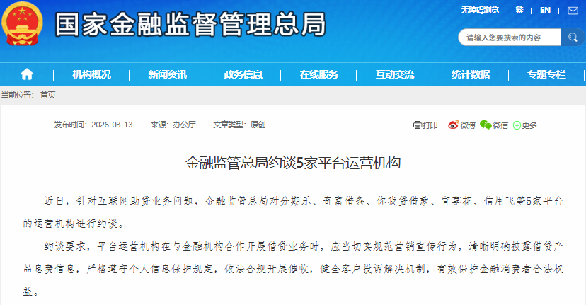 2026年3月13日,监管再出重拳:金融监管总局约谈5家头部平台,要求规范营销宣传、依法合规催收。