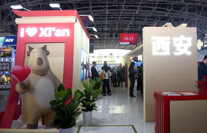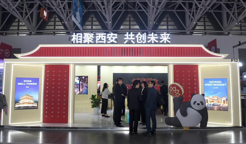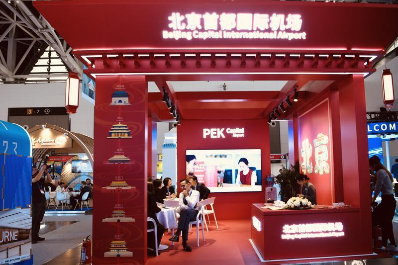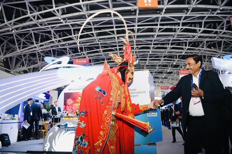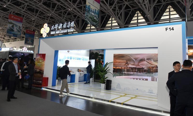 记者在现场看到,西部机场集团展台设计以蓝色为主色调,展台地面特别设置有跑道标线样式的图案,还配有城市文化旅游、地区经济发展、机场发展和嘉宾互动体验等内容,全面展示西安经济、社会、文化、航空枢纽建设等方面的发展成果。对面的西安咸阳国际机场展台,整体呈现中国传统建筑风格,展台内还摆放有礼盒甄糕、桃酥以及各式文创产品,极具西安特色。