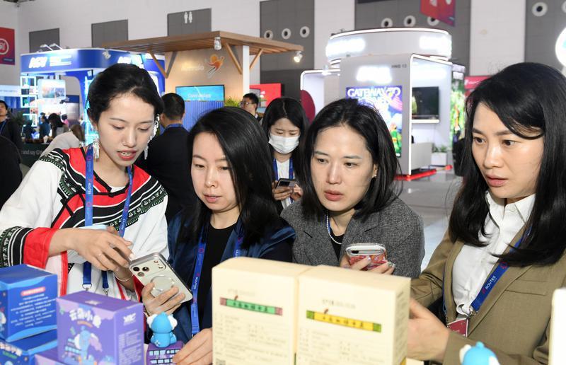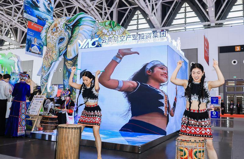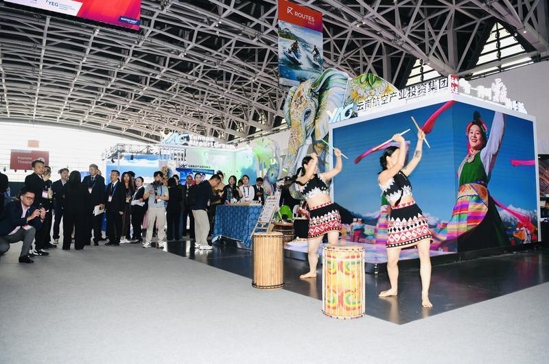 与光影动感的设计风格相映成趣的,是充满人文底蕴的云南航空产业投资集团展台。展台以憨态可掬的大象为核心视觉符号,巧妙融入扎染、彝绣、茶林等特色元素,生动展现“在这里生活,在这里追梦”的城市宜居底色。展区内,佤族舞者踏着节拍翩然起舞,身姿灵动、热情奔放;景迈山传统手工制茶技艺现场展演,缕缕茶香氤氲弥漫、沁人心脾;趣味十足的香囊DIY体验,吸引中外嘉宾踊跃参与,大家逐一辨识花材、细心装填香囊,沉浸式感受中华传统文化的魅力。
