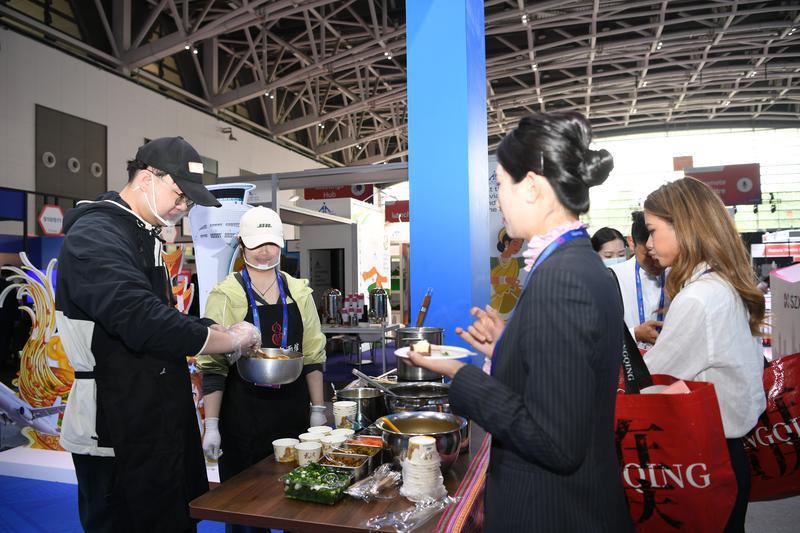 湖北机场集团则是将非遗代表性传承人带到了展台,作为蔡汉文面馆旧法八艺热干面的第四代传承人,蔡明伟现场为中外嘉宾制作非遗热干面,为保证口感,使用的面条都是当天早上空运而来,热乎乎的热干面下肚,参会者纷纷竖起大拇指。