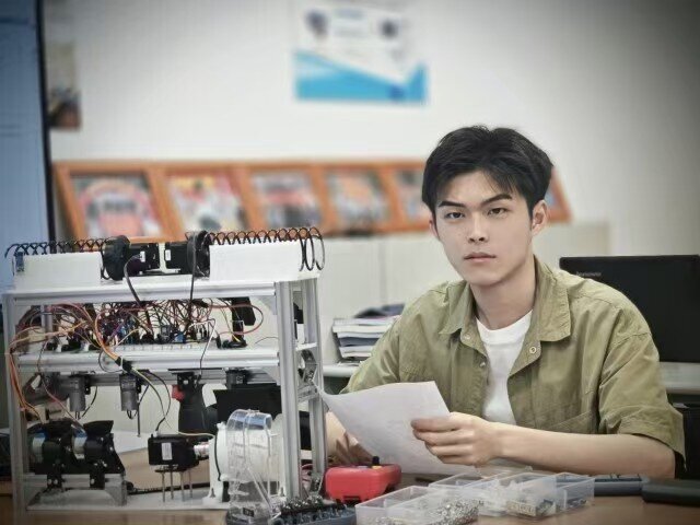 改变始于他加入学校“青橙工作室”。大二那年,董儒鑫和团队接到了研发“智能医废小车”的任务。初期设计的小车总是在转向时出现偏差,团队连续一周都没能找到问题所在。指导教师没有直接给出答案,而是带着他们去医院实地观察医废运输流程,分析场地狭窄、杂物较多等实际场景对小车的要求。最终,董儒鑫和小伙伴们通过优化传感器布局和算法,成功解决了转向问题。