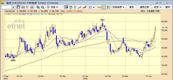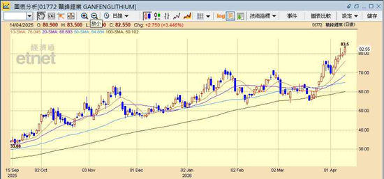 部署上,黄玮杰指,赣锋锂业股价近两日已创阶段新高,要有能力再创新高才有一定水位,反观天齐锂业1月时最高见过60.3元,现价仍有一定上望空间,且其RSI仍然强势,仍达70几。赣锋锂业则可参考10天线,因见其近期上升趋势,升了一轮后都会回试10天线支持,例如4月2日时其10天线处于67.7元,当日曾跌至69.2元,现时10天线大概76元,即约76.5元可考虑吸纳。