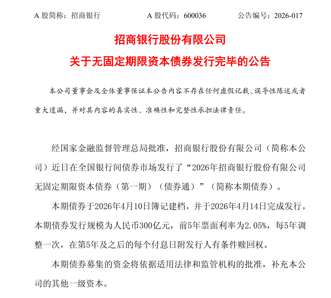 机构之家关注到,4月15日,招商银行对外发布无固定期限资本债券(也称“永续债”)发行完毕的公告,内容显示:该行近日在全国银行间债券市场发行了“2026年无固定期限资本债券(第一期)(债券通)”,发行规模为人民币300亿元,前5年票面利率为2.05%,每5年调整一次,在第5年及之后的每个付息日附发行人有条件赎回权。本期债券募集的资金将用于补充公司的其他一级资本。