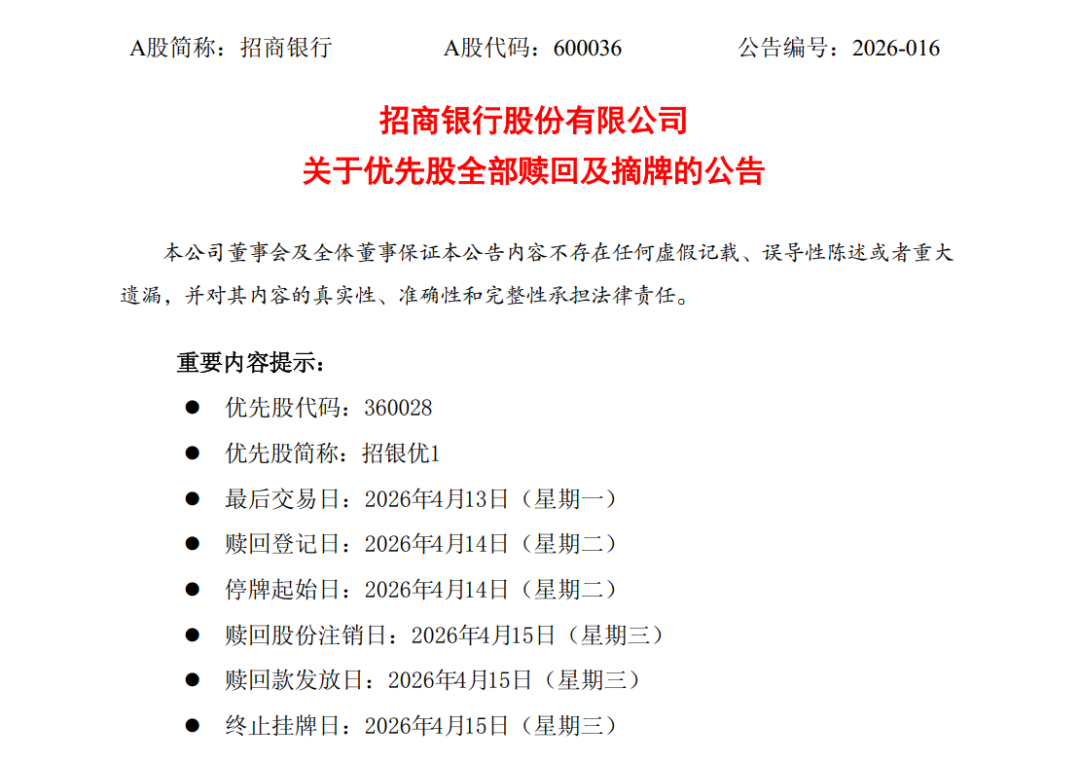 图片系招商银行公告赎回优先股