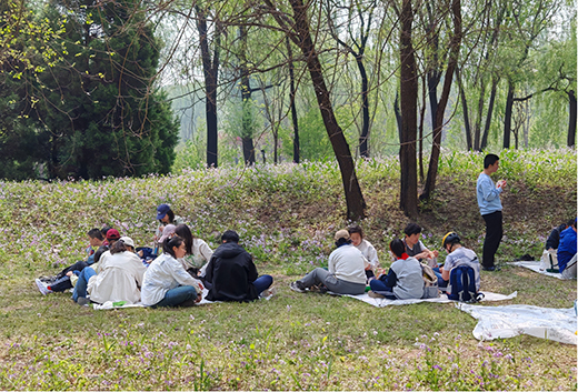活动中,学生们席地而坐,感受春天