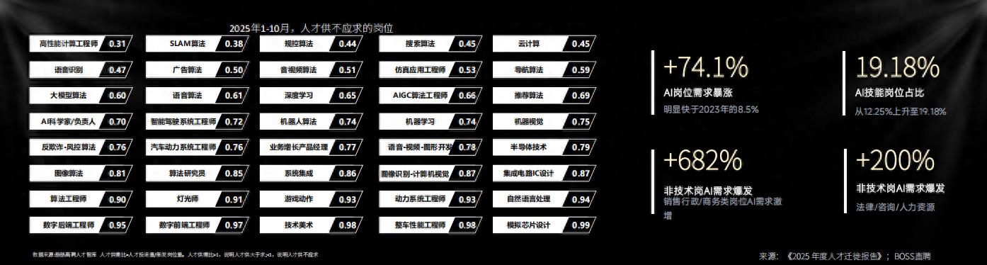 在这一判断下,中公教育发布面向AI时代的职业能力培养平台“新希天才”。按照官方定位,该平台并非单一课程,而强调通过真实业务场景训练,培养具备“上岗即战力”的AI应用型人才。这一产品形态的变化,也反映出AI技术快速渗透就业市场后,职业教育逻辑正在发生调整。数据来源:《2025 年度人才迁徙报告》;BOSS直聘/官方供图
