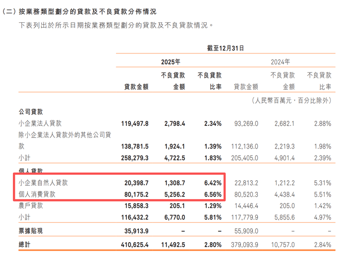 拆分来看,个人贷款不良率问题尤为突出。2025年年末,公司贷款不良率为2.34%,而个人贷款不良率高达5.81%,较上年末继续上升0.84个百分点。其中小企业自然人贷款和个人消费的不良率均在6%以上。