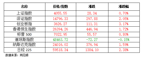 4月16日国内市场集体反弹,深成指涨超2%,创业板指涨超3%,继续刷新近11年新高。黄白两线分化明显,权重股走势较强,宁德时代续创新高的同时总市值反超中国石油跃居A股第三。沪深两市成交额2.34万亿,较上一个交易日缩量736亿。盘面上,市场热点快速轮动,全市场近4300只个股上涨。从板块来看,算力产业链持续走强,其中算力租赁概念领涨两市,十余只成分股涨停,算力硬件概念集体拉升,电池产业链爆发,医药板块震荡调整。截至收盘,沪指涨0.7%,深成指涨2.05%,创业板指涨3.17%。