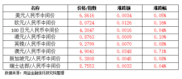 中国人民银行授权中国外汇交易中心公布,2026年4月16日银行间外汇市场美元兑人民币汇率中间价为:1美元兑人民币6.8616元。今日最新美元指数报98.0215,上涨-0.0607%。截至上一交易日纽约汇市尾市,美元指数收于98.0810,欧元兑美元收盘报1.1796,英镑兑美元收盘报1.3566,美元兑日元收盘报158.9560,澳元兑美元收盘报0.7166,美元兑瑞士法郎收盘报0.7817,美元兑加元收盘报1.3736,美元兑瑞典克朗收盘报9.1543。