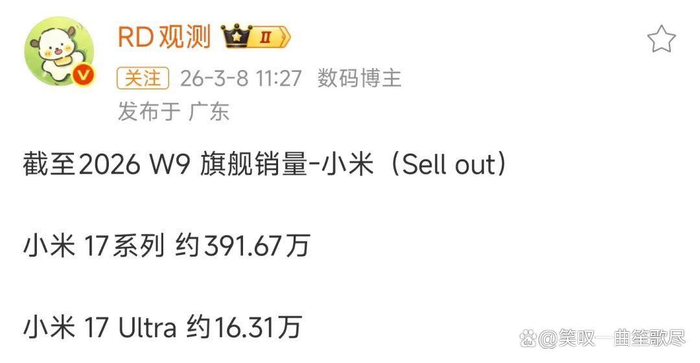 国产旗舰销量前三,小米17系列必有一席,截至2026年W9,小米17系列销量约391.67万台,很快就会破400万。