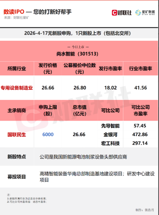 今日无新股申购;有1只新股上市,为创业板的尚水智能。