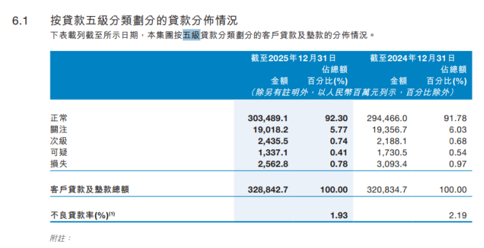 真正令人警惕的,是关注类贷款的占比。年报数据显示,九江银行贷款5级分类中,关注类贷款占比达5.77%,较上一年度的6.03%虽然略有下滑但仍处行业高位,以3288亿元的贷款及垫款总额来看,关注类贷款规模达190亿元,加上不良率本身,九江银行合计接近8%的贷款处于非正常状态,正常类贷款仅占92.3%,这一比例在上市城商行中已属较高水平。