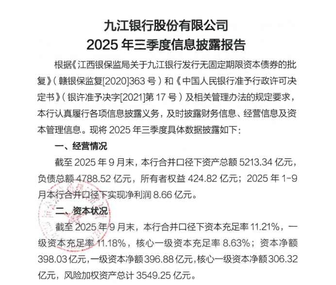 中国货币网发布的九江银行2025年三季度信息披露显示,去年1-9月份该行实现净利润8.66亿元,而到了2025年年报业绩时,该行的净利润只有8.41亿元,较9月底少了2500万元,这也意味着九江银行第四季度出现了亏损。