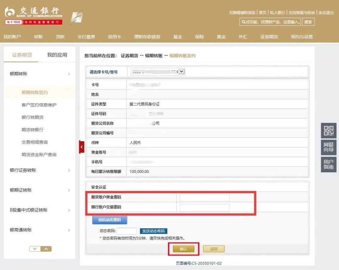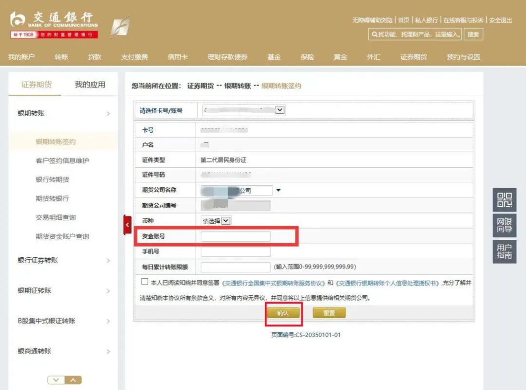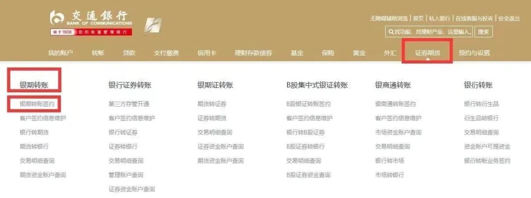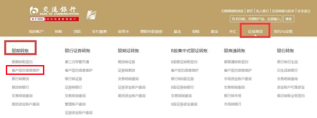 1.登录交通银行个人网银账户,点击“证券期货”→“银期转账”→“银期转账签约”。