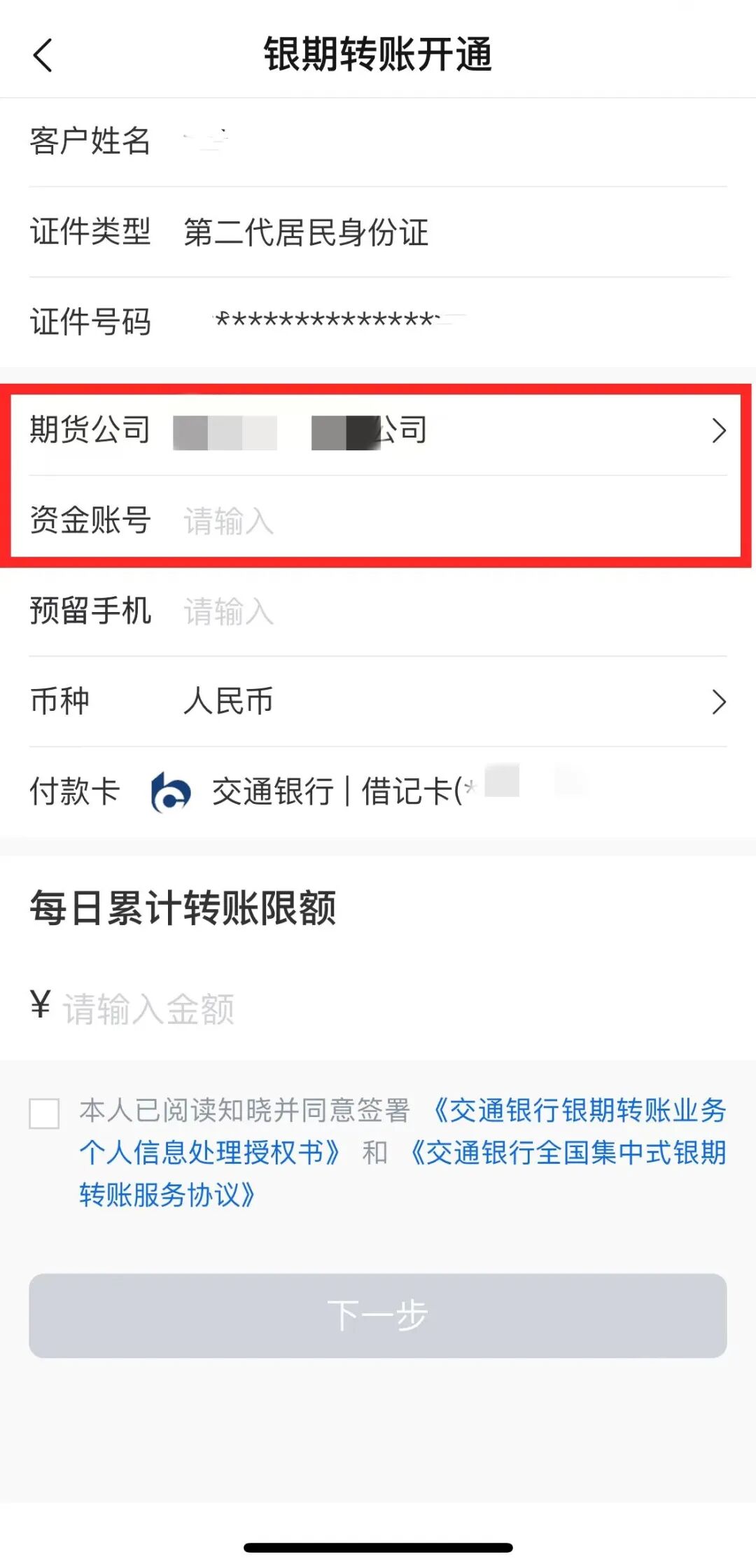 2.点击“办理新的银期转账签约”。选择“广州期货股份有限公司”,填写期货资金账号和预留手机号,选择已在我司绑定的银行卡,勾选协议,点击“下一步”,继续完成签约。