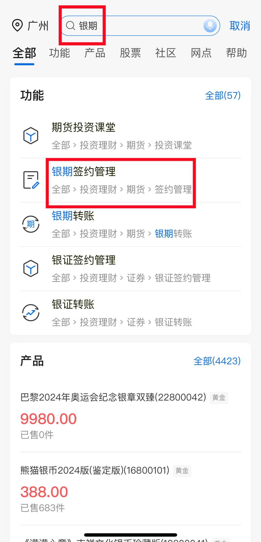 1.登录个人账户,在首页最上方搜索栏输入“银期”,点击“银期签约管理”。